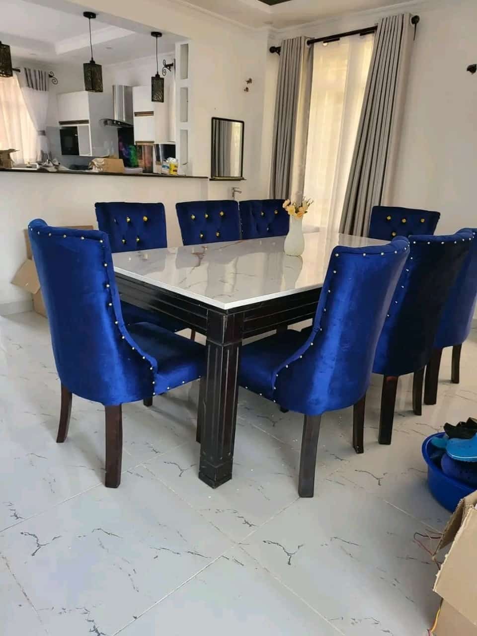 A sophisticated and contemporary piece of furniture that elevates dining areas is a luxury dining table set with velvet-upholstered chairs. It usually has a robust table with a long-lasting oak base and a smooth marble or marble-like surface. A touch of sophistication and comfort is added by the set's luxurious velvet-upholstered chairs with button-tufted backs and nailhead trimmings. This set blends classic design with practicality, making it ideal for formal dining spaces.